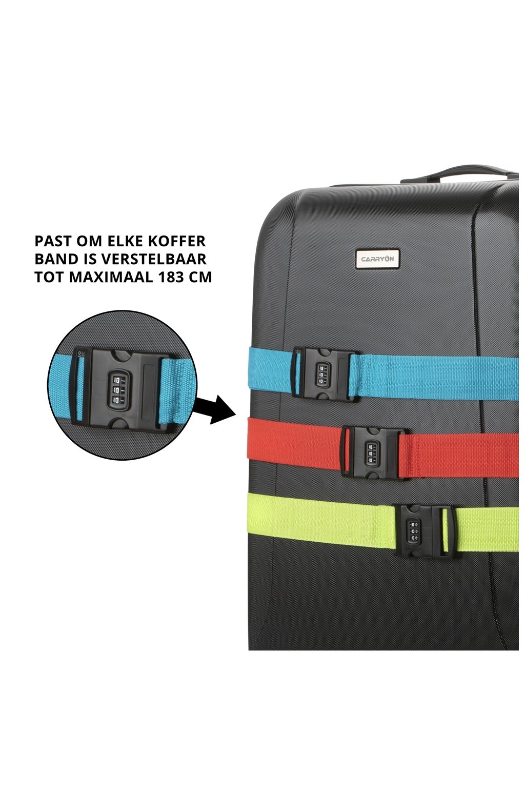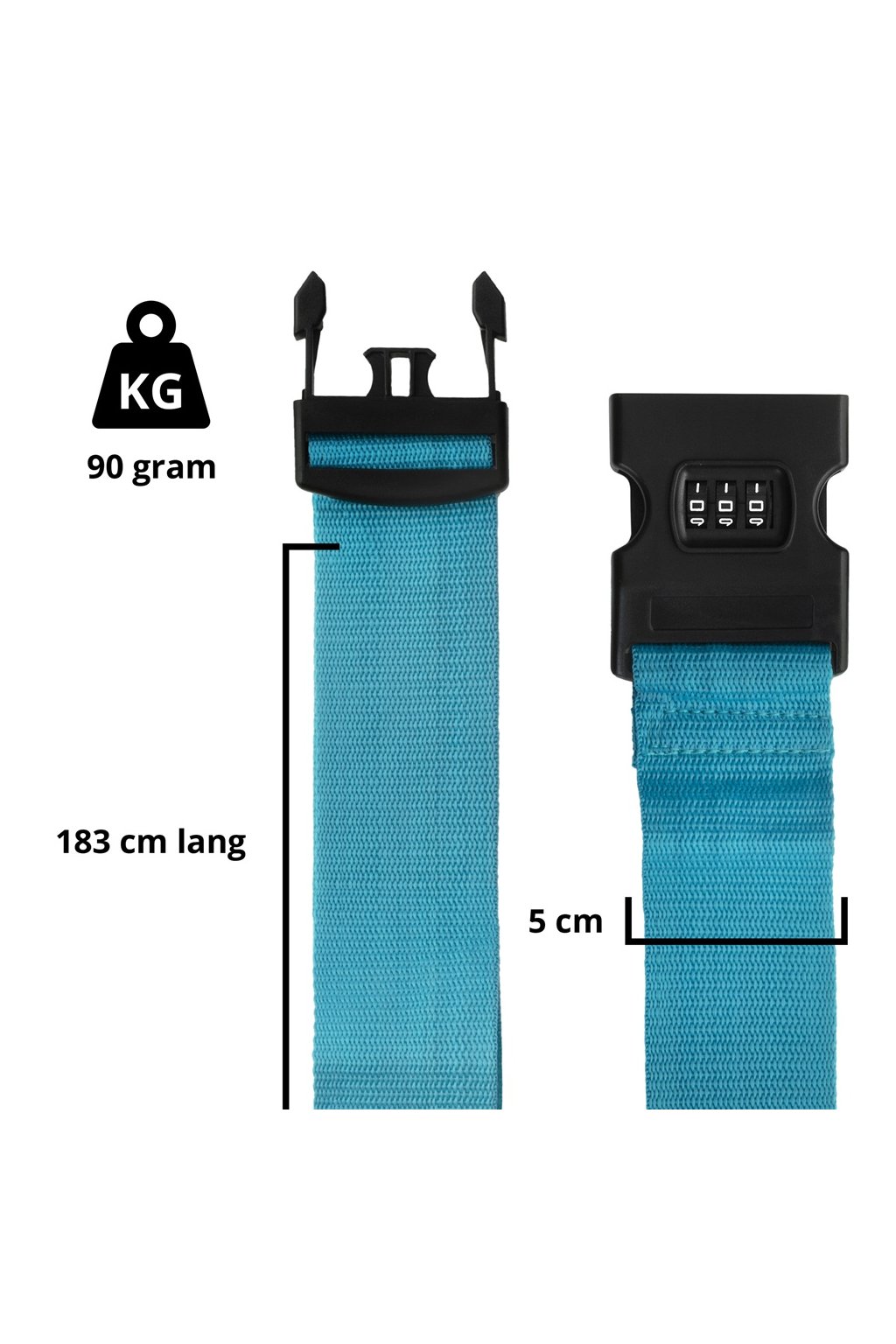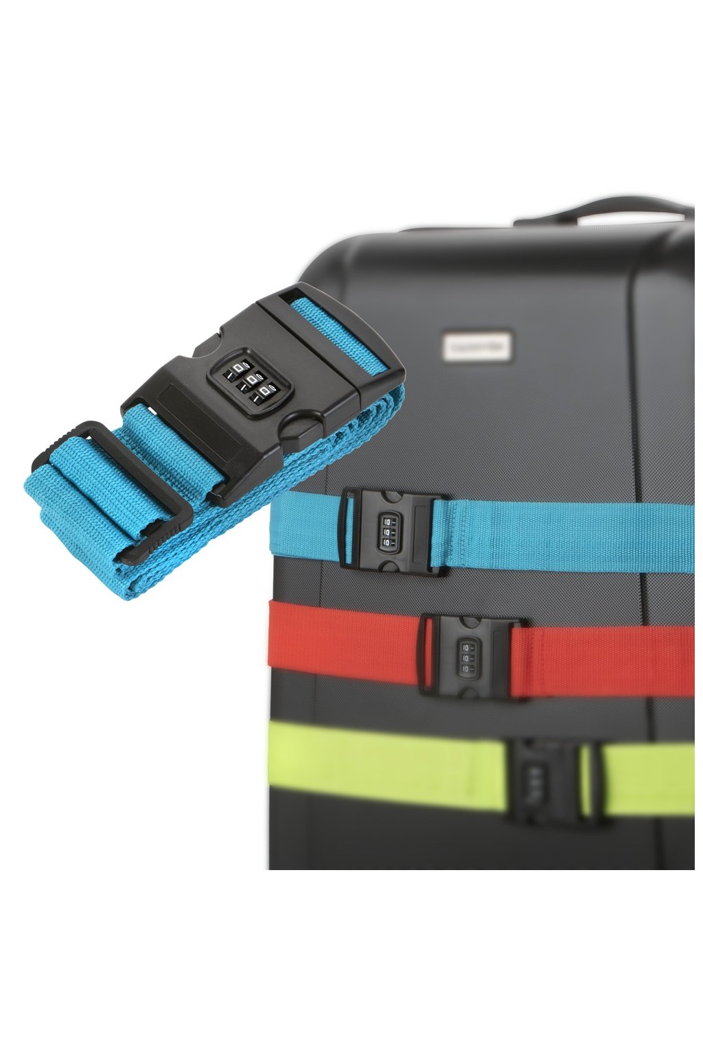 Nastaviteľný pás s maximálnou dĺžkou 183 cm a zapínajúcou sa čiernou plastovou prackou. Šírka pásu je 5 cm. Pás je možné uzamknúť zámkom s trojčíselným kódom a zaistí bezpečnosť vašej batožiny na cestách.