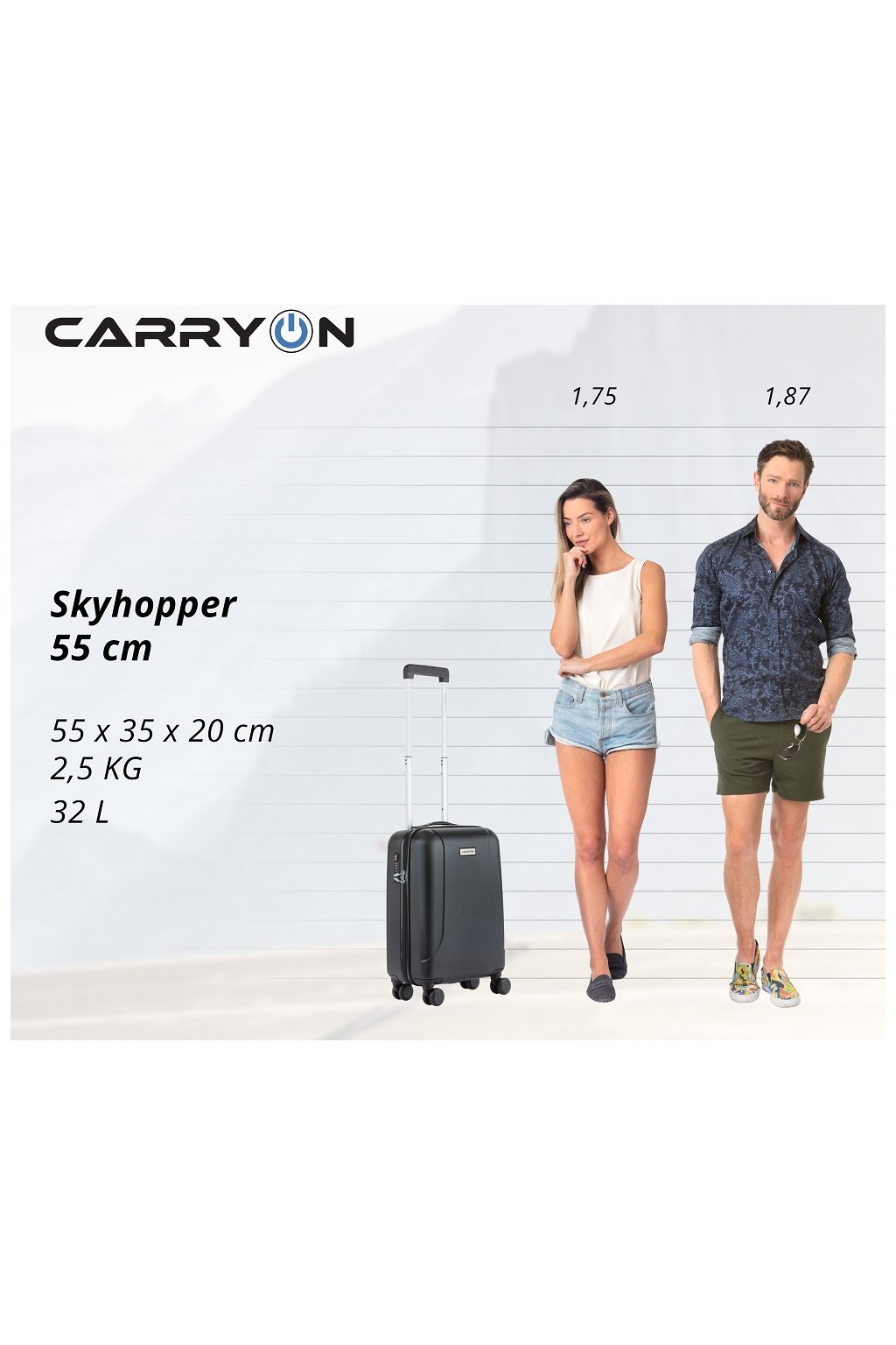 Skyhopper je moderná batožina, ktorá spĺňa všetky nároky na cestovanie. Škrupina je z kvalitne spracovaného polykarbonátu. S vytiahnutou vysunovacou rukoväťou narastie výška na 105 cm a samozrejme nechýbajú pevné rúčky. Vnútri nájdeme zipsom oddelený priestor, praktický organizér aj fixačné popruhy, všetko doplnené príjemným polstrovaním.