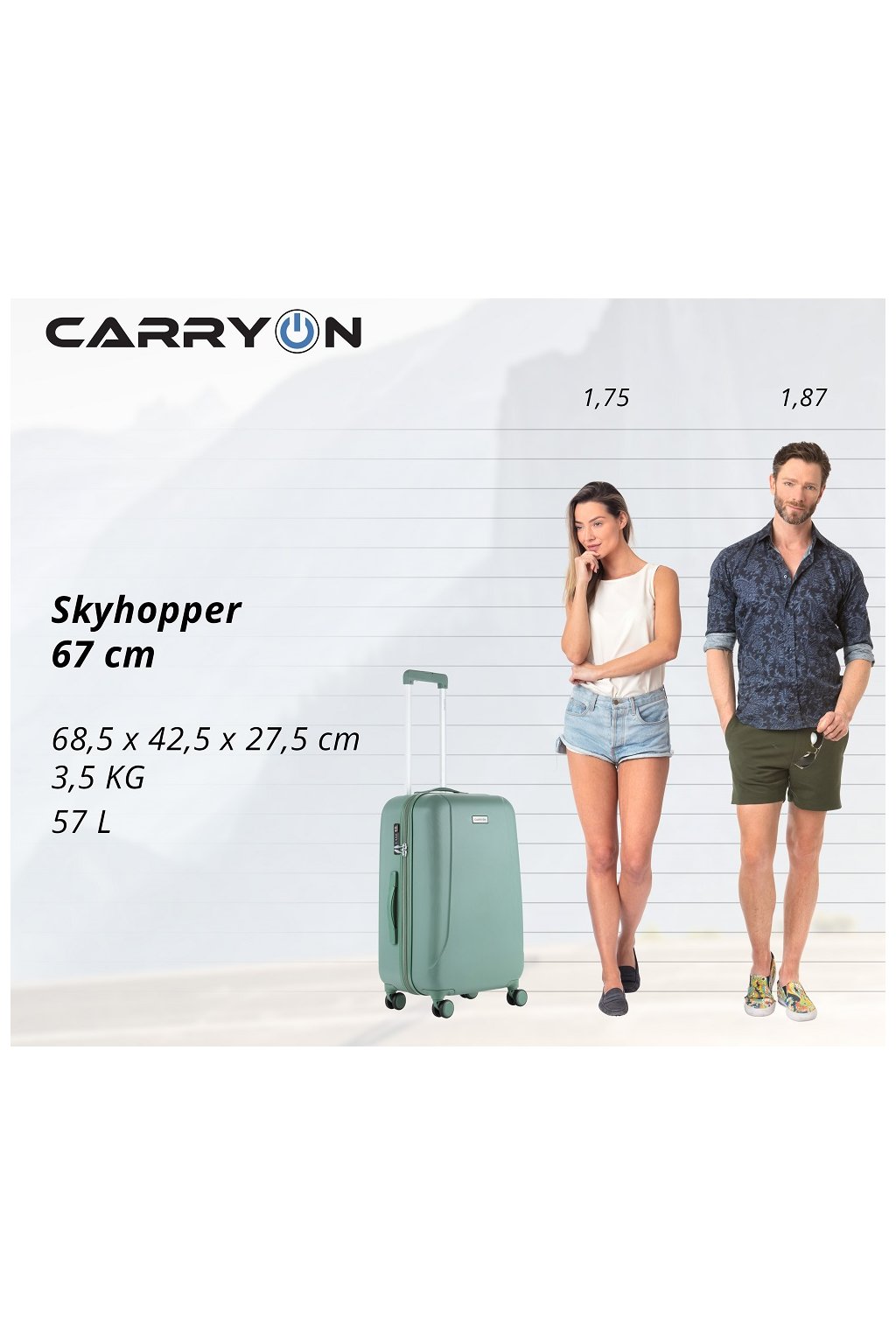 Skyhopper je moderná batožina, ktorá spĺňa všetky nároky na cestovanie. Škrupina je z kvalitne spracovaného polykarbonátu. S vytiahnutou vysunovacou rukoväťou narastie výška na 105 cm a samozrejme nechýbajú pevné rúčky. Vnútri nájdeme zipsom oddelený priestor, praktický organizér aj fixačné popruhy, všetko doplnené príjemným polstrovaním.